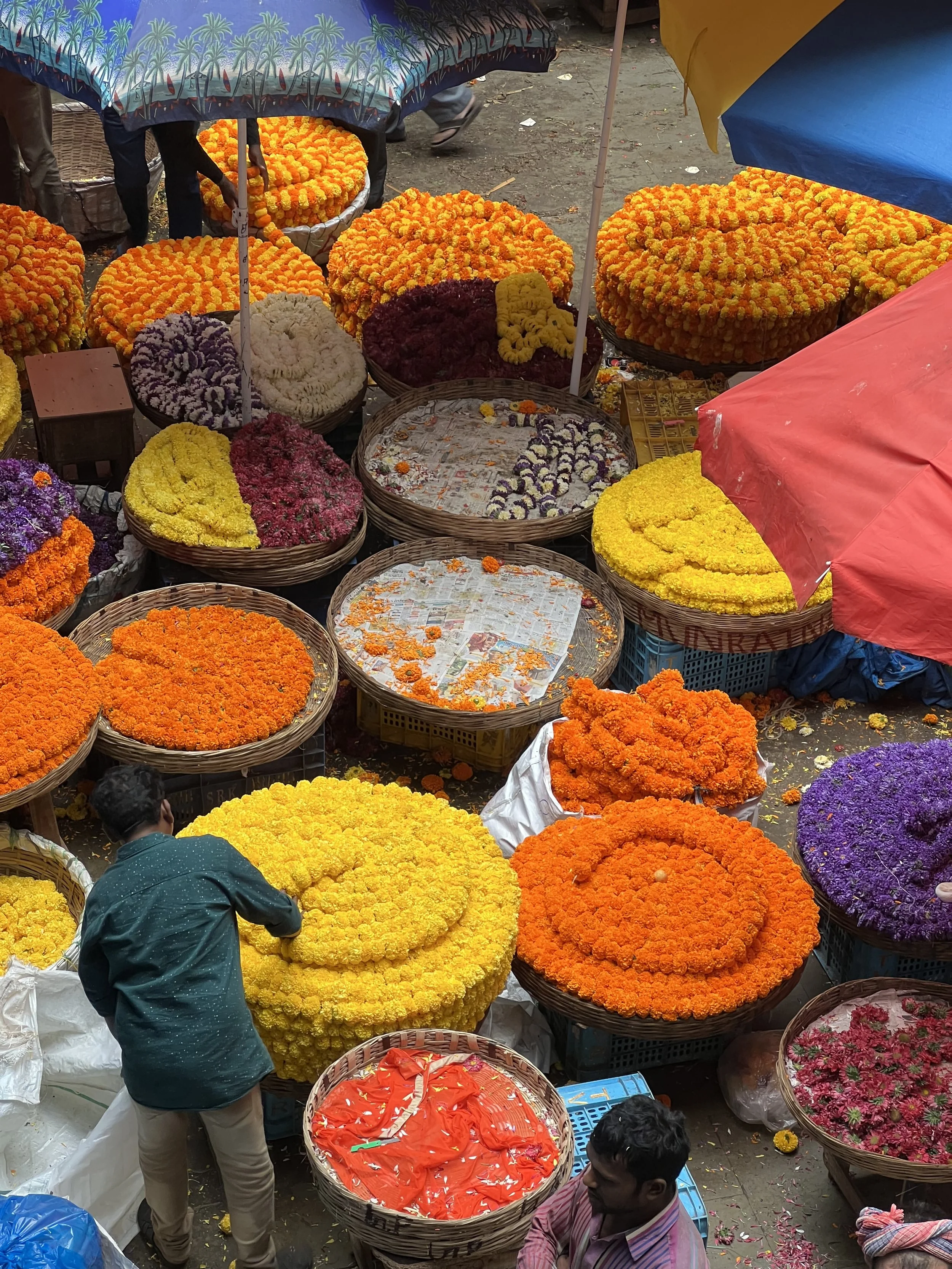 The KR market was a busy and overwhelming experience. Every inch was packed with people either selling or buying. There were stands and tarps laid out everywhere selling everything thing you could imagine from food to clothing to electronics to knick knacks. The market itself was in and surrounding what felt like an abandoned mall. Inside the mall was a mix of open shops and derelict corners. Perhaps people were living there as well as the odd cow inside. At the basement of the mall was the proper flower market where huge chains of flowers were being strung together. You could buy many vibrant arrangements here of all shapes, colors, and all by weight.