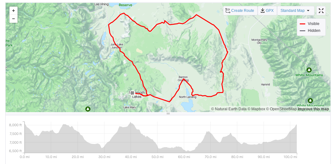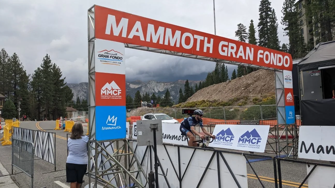 Following the stop, I mostly spend the last 65 km by myself. I occasionally ran into a person here or there but nobody could stay with me. Nearing the end, I found a guy and we traded turns for a good 10-15 km. This was very helpful as there was a decent head/cross wind going toward the last turn. Once I was on the road back into Mammoth I went on my own. A woman on an E-bike was strangely half-wheeling my back wheel for a while, passed me, then drafted me again. Near the end, I passed her definitively and went for the finish.